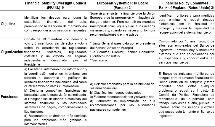 Fuente: Elaboración propia con base a información del 1/U.S. Department of The Treasury (2022); 2/European Systemic Risk Board (2022); 3/Financial Policy Committee - Bank of England (2022).