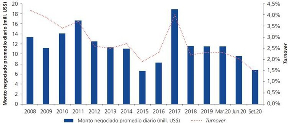 Este índice ha tenido su punto de inflexión desde el marzo del 2020 hasta septiembre del 2020, tiempo en el que, se produce la aplicación de las políticas gubernamentales por la pandemia, lo que origina un desplome de los montos negociados en promedio dentro del territorio nacional dando en su conjunto un movimiento aproximado de 6 millones de dólares, lo que representó un tunover o rotación del 1,5% de los capitales.