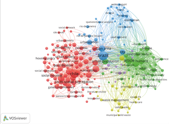 En la ilustración 1 se observa la estructura de palabras clave en relación con la fragmentación urbana en ALyC, la cual se desarrolló a partir de las keywords plus de los artículos contemplados en la muestra. Dentro de las palabras claves destacadas de la búsqueda se encuentran: Brazil, sustentado por ser el país con el mayor número de investigaciones relacionadas con el área, así como también diferentes países como México, Argentina, Chile, Sao Pablo, haciendo alusión a los diferentes casos de estudios presentados en las investigaciones.