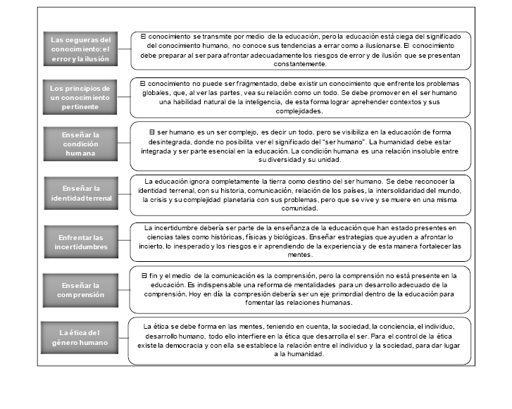 Saberes esenciales para que la educación del futuro tenga en cuenta el pensamiento complejo, la tierra, la incertidumbre, la comprensión al ser humano, el conocimiento, el error y la ilusión y la ética.