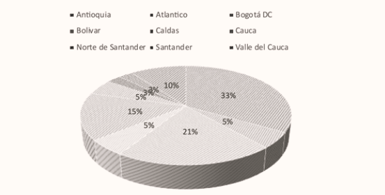 Las universidades siguen avanzando en la creación de emprendimiento e innovaciones directamente relacionadas con el desarrollo socio-económico de las regiones, el potencial de participación por Departamento se aprecia en el gráfico 4, liderando Antioquia (33%), seguido por Bogotá (21%) y Caldas (15%).