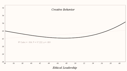 Sin embargo, una percepción débil de liderazgo ético puede inclinar al seguidor hacia respuestas mecánicas que eviten el riesgo. En consecuencia, la relación entre liderazgo ético y comportamiento creativo está sujeta a una interpretación subjetiva; es decir, una baja o alta percepción de este estilo de dirección, generará reacciones opuestas que obstaculicen o beneficien las conductas creativas (Santiago-Torner, 2023a). En ese sentido, se propone que la unión entre estos constructos es curva en forma de U.