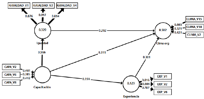 Chahar, Hatwal, & Sen (2019) encontraron que la capacitación fomenta el CO; para Daniëls, Muyters & Hondeghem (2021) la capacitación influye en la percepción de docentes sobre el CO. La capacitación es medida de intercambio social, coadyuva en el logro de un clima de igualdad (Gould-Williams, 2007). En tal sentido se plantean: H1: La capacitación afecta positiva y significativamente a la igualdad; H2: La capacitación afecta positiva y significativamente a la experiencia personal; H4: La capacitación impacta positiva y significativamente al CO.