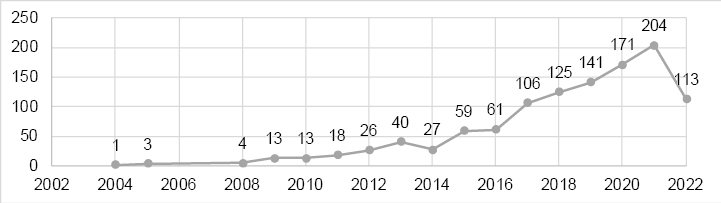 Como se aprecia en la Tabla 1, el resultado arrojó 528 fuentes de documentos, y un total de 1184 trabajos relacionados con dichos términos, el trabajo más antiguo data del 2004 y los más nuevos se realizaron en el 2022, la edad promedio de los trabajos desde su publicación, calculada hasta el mes de septiembre del 2022 (momento en que fueron consultados los datos) fue de 3.74 años, lo que significa que la mayoría de esta literatura es reciente. Por otra parte, se encontró que en promedio un documento de esta muestra tiene un promedio de 19.66 citas, y que al año es usado como referencia por 4.6 documentos.