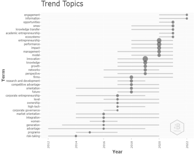 En la Ilustración 4 se muestran las palabras clave más utilizadas en los documentos a lo largo de los años. Se destaca que, en 2014, “risk-taking” fue el término más empleado, seguido de “programs” en el año siguiente. En 2016, las temáticas clave abarcaron “advantage,” “generation,” “woman,” “integration,” y “market orientation,” reflejando mayor diversidad debido al aumento en publicaciones. En 2020 y 2021, surgieron nuevos términos como “ecosystems” y “academic entrepreneurship,” relacionados con el contexto del emprendimiento, pero no se encontraron en los documentos de 2022.