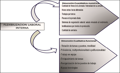En lo que respecta a la flexibilización laboral de tipo interno, para González-Posada y Martínez (2022) tiene que ver con políticas y estrategias orientadas a gestionar los cambios y lograr la adaptación de la empresa mediante una idónea gestión de su recurso humano, mientras que para Urquijo (2004) es la multifuncionalidad en los puestos de trabajo que resulta de la aplicación de funciones en la fuerza laboral, garantizando de esta forma el desempeño del trabajo en diversas áreas con las habilidades necesarias para realizar sus actividades laborales
