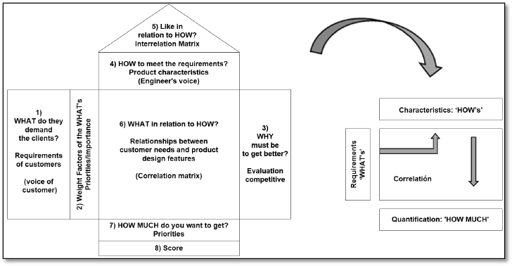 According to Moges, (2009), it is regularly composed of four phases: product planning, product design, process planning and finally process control. Each of these matrices have their importance, but it is considered that the first, known as House of Quality (HoQ) is the most important, from this in turn others are developed at more specific levels of work depending on the approach that is being developed, product, process, or service. The HoQ is mainly structured by eight parts which are exemplified in Diagram 1.