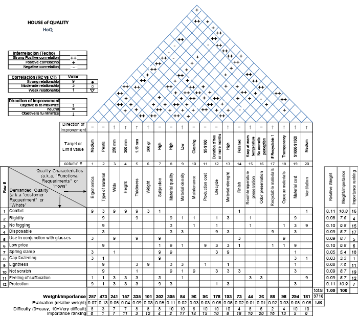 HoQ is a useful method that can be applied during the design process to optimize and improve products, as well as in the post-production process for future development and revision. This allows identifying and weighing the critical requirements of the important ones, appropriately allocating the economic, human, and material resources.