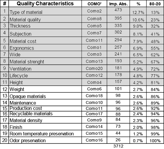 Once the most important technical characteristics were identified, they were ranked based on absolute importance (Table 2). It means that of the 20 generated, 11 are the most important, and in which more attention should be paid, possibly allocating more resources of money, materials and/or human resources if required. These quality characteristics mean that the most important is the type of material, which must be modified or changed, to meet the needs of most customers, the other two in that order of importance are the quality of the material and the thickness. of the same.