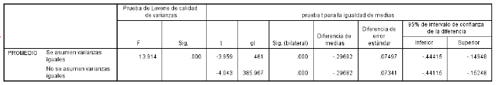 En la tabla 2 se presentan los resultados de la prueba t de Student que permitió determinar que no existe diferencia significativa (p=0.000) en el promedio general del primer período antes y después de la certificación del proceso enseñanza aprendizaje.