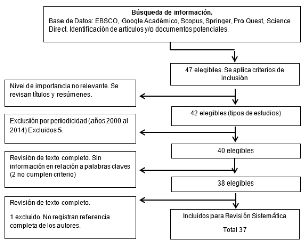 Es importante indicar que los documentos seleccionados provienen de fuentes científicas y han sido validado por expertos. Los criterios de inclusión son; aporte de contenido al presente estudio, la revisión de los títulos y resúmenes, descartando aquellos artículos que no aportan información relevante y no se alinean con los objetivos de guardan relación con los lineamientos de inclusión relevantes, y finalmente se procede con el análisis del documento completo y extracción de la información que será usada en la investigación (diagrama 1).
