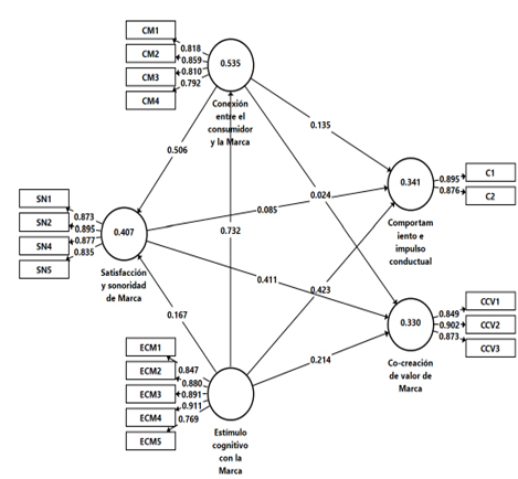 En la tabla 1 se muestra los valores obtenidos, y se observa que el ítem C3 del factor: Comportamiento e impulso conductual, no alcanza el umbral deseado (0,420) por lo que fue retirado del modelo; del mismo modo con el ítem SN3 del factor: Satisfacción y sonoridad de Marca, obteniendo un valor de (0,678) no alcanzaría el umbral deseado, los demás ítems del modelo propuesto expresan rasgos de confiabilidad.