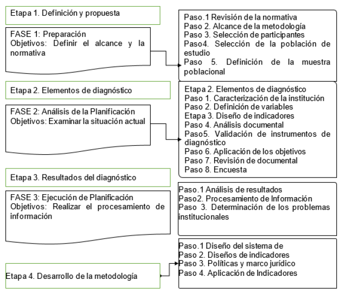 En la fase (II) de la metodología, los conceptos del objeto de estudio se separaron en variables utilizando un corte en el dendograma, conforme a las características del objeto de estudio. En la fase (III), se estructuran las fases y etapas de la metodología del modelo de planificación, cada una detallando tareas, técnicas y productos a obtener (diagrama 1)