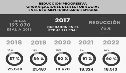 A inicios del año 2019 quedaban 66.820, de las cuales 48.150 fueron reclasificadas al sistema ordinario para el 2020, y al 2021 quedaron solo 18.324, reduciéndose hasta en un 91% las ESAL calificadas en el régimen tributario especial, y para el 2022 hubo un aumento poco significativo de 189 que se actualizaron, pero, aun así, la reducción corresponde al 90% de la población correspondiente a un total de 18.513.