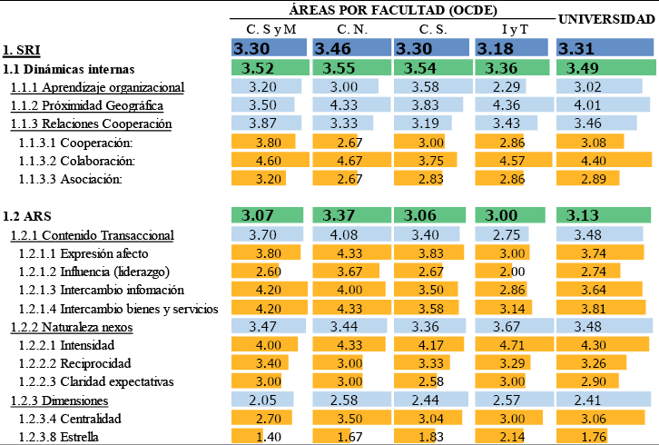 El modelo considera 62 reactivos agrupados en 4 bloques que recrean dinámicas del grupo de investigación, del SRI, de las empresas y universidades, los cuales generan 60 indicadores, llegando al «Índice tasa de incidencia de TC en SRI» que por área de conocimiento alcanza los valores entre 45 % y 60 %, C. M. y S. (59.8 %), C. N. (45.6 %), C. S. (61.6 %) y I. y T. (45 %), con un valor institucional de 53 %. Este indicador producto de la combinación de 41 indicadores directos (14 SRI – 27 TC) y 18 indicadores compuestos (7 SRI – 11 TC). Una virtud del modelo es que es modular y permite la comparación entre actores del SRI en diferentes niveles. En el primer caso, por ejemplo, el área de I. y T. aquí analizado, agrega a 7 investigadores de 4 grupos de investigación (grupo por programa académico), es decir, puede analizarse individualmente, por grupos, por facultad, por institución, y si es del caso, entre instituciones del SRI.