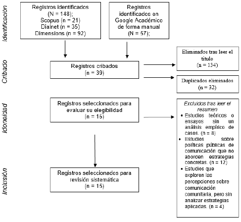 Entre los criterios de exclusión se destacan: a) Estudios teóricos o ensayos sin un análisis empírico de casos; b) Estudios sobre políticas públicas de comunicación que no aborden estrategias concretas; c) Estudios que exploren las percepciones sobre comunicación comunitaria, pero sin analizar estrategias aplicadas. Se incluyeron un total de 148 artículos y textos, de los cuales 134 fueron excluidos tras leer el título y 32 por estar duplicados. De esta manera, se revisaron 39 artículos, excluyendo 8 estudios teóricos o ensayos sin un análisis empírico de casos, 12 estudios sobre políticas públicas de comunicación que no aborden estrategias concretas y 4 estudios que exploren las percepciones sobre comunicación comunitaria, pero sin analizar estrategias aplicadas, quedando así seleccionados un total de 15 artículos para esta revisión sistemática (Diagrama 1).
