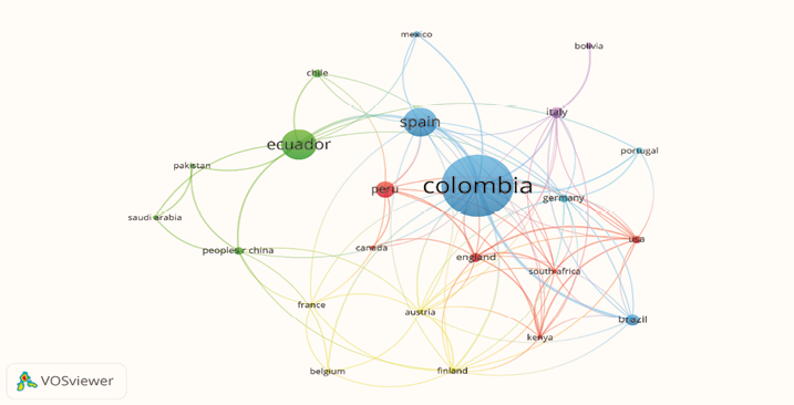 En el diagrama 1 muestra los países con mayor número de publicaciones científicas en EC: Colombia, seguido Ecuador, luego Perú y poca participación Bolivia; se aprecia, además, la contribución de autores externos a la región. Colombia, el que mayor conexión realiza, con investigadores de España, Italia, Francia, Inglaterra, y Brasil, a menor escala con países de otras regiones.
