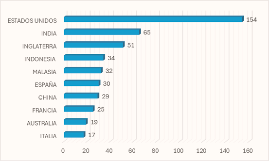 De acuerdo con la imagen se observa que el país con más ventaja es Estados Unidos, siguiéndole India e Inglaterra. También se observa que la mayoría de los países destacados se encuentran en Asia, aunque se aprecian algunos ubicados en Europa.