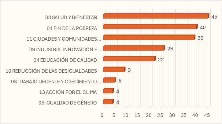 Mediante el gráfico 2 se analizan los Objetivos de Desarrollo Sostenible más impactados por la información consultada, concluyéndose que los ODS que tienen más respaldo corresponden a Salud y Bienestar (#3), Fin de la Pobreza (#1), Ciudades y Comunidades Sostenibles (#11) e Industria, Innovación e Infraestructura (#9).