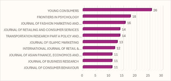 El gráfico 3 ilustra las revistas más activas en materia de decisión de compra y desarrollo sostenible con enfoque en las generaciones Y y Z. Aunque se aprecia gran diversidad entre ellas, la que más muestra contenido científico es Young Consumers (Consumidores Jóvenes).