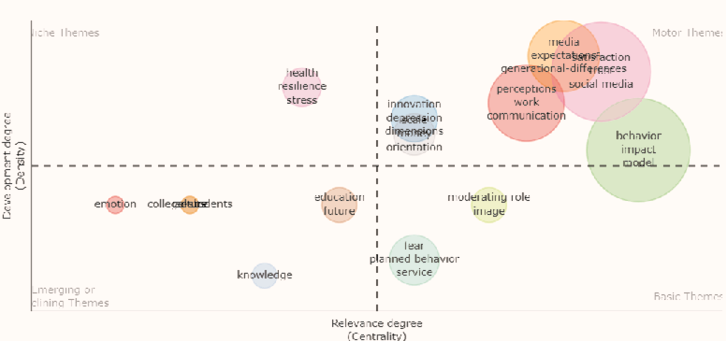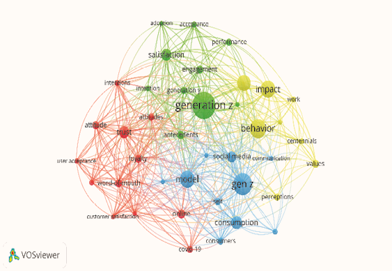 El diagrama 1 muestra los resultados de análisis de coocurrencia de palabras claves de los artículos estudiados para el proceso cienciométrico. Dichos hallazgos permiten observar la interacción de las palabras clave en cuatros clústeres, de los cuales se destaca “generation z” que cuenta con la mayor coocurrencia y fuerza en las conexiones con demás términos, seguidamente se encuentran otras palabras clave como “gen z”, “model”, “trust”, “satisfaction”, “loyalty” o “behavior”.