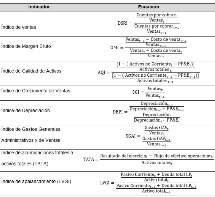 Si el puntaje M obtenido del modelo supera -2.22, se considera probable que la entidad haya manipulado los datos contables o que esté motivada para hacerlo Beneish (2001), Warshavsky (2012), Drábková, (2014), Mahama (2015) y Aljinovic et al, (2017). Las empresas con puntajes M más altos tienen una mayor probabilidad de estar involucradas en la manipulación de la información financiera, reportada Warshavsky (2012). A continuación (Cuadro 1), se presentan los indicadores que conforman el modelo de puntaje M de Beneish: