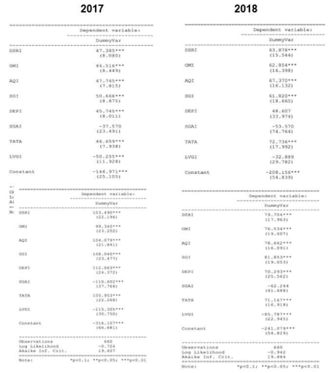 El modelo Beneish M-Score se empleó para identificar posibles prácticas contables, agresivas o manipulaciones en los estados financieros. Este enfoque ofrece una métrica valiosa para evaluar la probabilidad de manipulación de resultados financieros, permitiendo así discernir entre empresas con información más confiable y aquellas que podrían presentar riesgos potenciales en términos de calidad de los datos financieros. Adicionalmente, se implementaron los modelos Logit y Probit para realizar un análisis más amplio de los factores que podrían influir en la calidad de la información financiera. Estos modelos permiten examinar variables clave que podrían afectar la integridad de los reportes financieros, ofreciendo una comprensión más profunda de las dinámicas internas y externas que podrían estar influyendo en la presentación de información por parte de las empresas manufactureras colombianas.