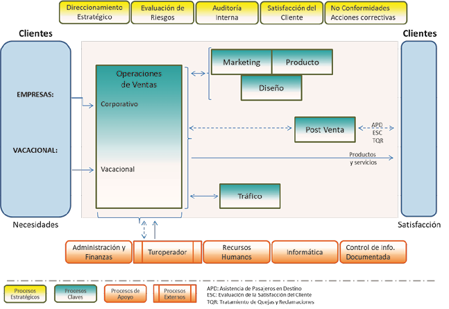 En el modelo de negocio de las agencias de viajes objeto del estudio, fundamentalmente existen dos tipologías de clientes: el cliente vacacional o todo aquel que solicite servicios vacacionales, es decir, aquel consumidor de productos turísticos que solicita servicios para disfrute propio o de un tercero en el ámbito personal, y, por otra parte, está el cliente del tipo corporativo, el que solicita servicios para llevar a cabo una labor profesional en representación y con autorización de su empleador. Operacionalmente como los procesos que tienen contacto directo con las necesidades de los clientes o usuarios finales, traducidas en requisitos de los servicios solicitados y guardan relación directa con la percepción de la satisfacción de dichos requisitos.
