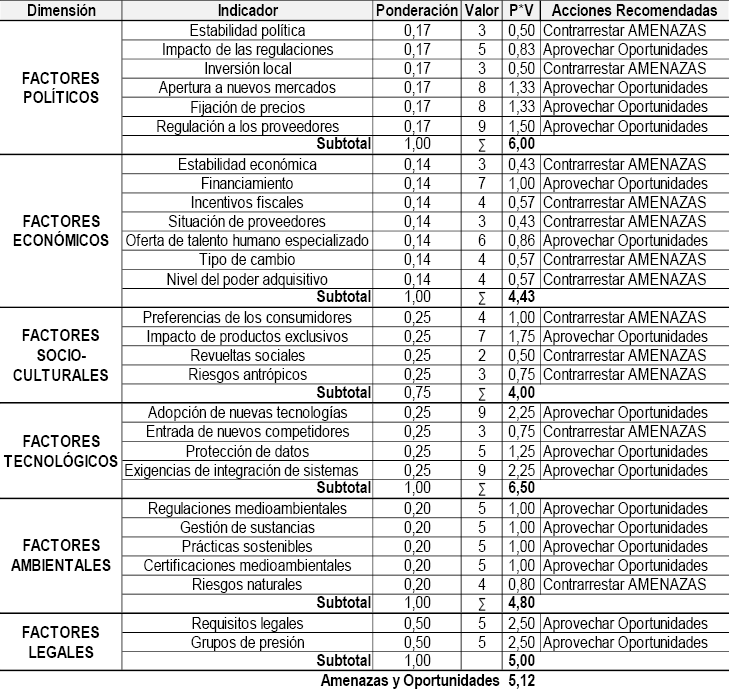 Luego de determinados los procesos del negocio, se procedió a aplicar la técnica de análisis PESTEL para el entorno en forma cualitativa como base del análisis. Mediante reuniones con los expertos se determinó en consenso las respectivas denominaciones de los aspectos Políticos, Económicos, Sociales, Ambientales y Legales reinantes en el entorno de la región de Sudamérica y su impacto al sector, lo que es de gran utilidad para comprender el crecimiento o declive del mercado y, en consecuencia, las cuestiones que influyen en la rivalidad competitiva del negocio.