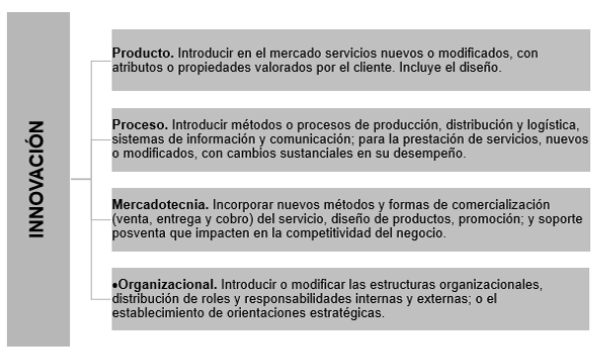 El Manual de Oslo (Organisation for Economicy Co-operation and Development [OECD], 2018a: 60) señala que la innovación es “un producto o proceso nuevo o mejorado (o una combinación de los mismos) que difiere significativamente de los productos o procesos anteriores de la empresa y que ha sido puesto a disposición de los usuarios potenciales (producto) o puesto en uso por la propia empresa (proceso)”. De acuerdo con este Manual, coexisten cuatro tipos de innovaciones (Diagrama 1):