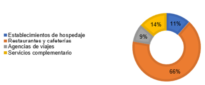 Se destaca que el 66% de las empresas son establecimientos de alimentos y bebidas (restaurantes y cafeterías); 14% ofrecen servicios complementarios (arrendadoras de automóviles, guías de turistas y venta de artesanías); 11% son establecimientos de hospedaje y 9% son agencias de viajes (Gráfico 1). Del total, 93% son organizaciones independientes y 7% pertenecen a una cadena. En cuanto a los años de antigüedad, 58% tiene de 1 a 5 años en operación y el resto más de 5 años. Por último, se confirma que 63% son empresas familiares (Ghazali, 2005).