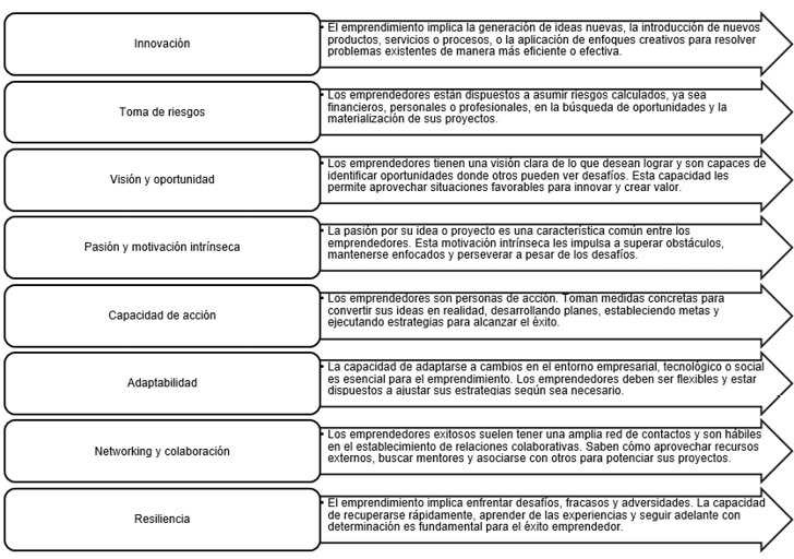 En esencia, el emprendimiento involucra la combinación de habilidades como la creatividad, la resolución de problemas, la toma de decisiones, la gestión de recursos y la capacidad de adaptación frente a situaciones cambiantes (Ruíz e Iglesias, 2021). Es un proceso dinámico y multifacético que impulsa la innovación, la competitividad y el progreso en diversos ámbitos de la sociedad (Frese y Gielnik, 2014).
