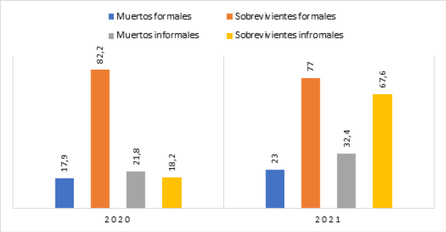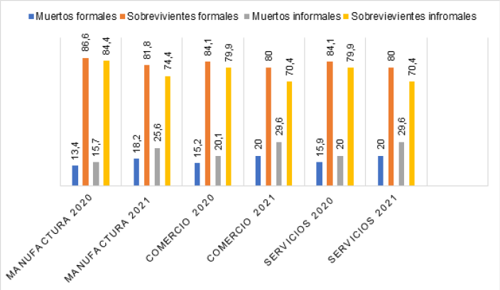 Por su parte, los datos reflejados para el 2021, la situación relevante a la del año anterior, el 23% de los formales no lograron sobrevivir, mientras que el 32,4% de los informales también cerraron. Se destaca que, a pesar de que hubo un intento de apoyar a las empresas, muchas no lograron resistir los impactos de la pandemia; sin embargo, se destaca que este apoyo no cubriría a todas las empresas (tabla 2).