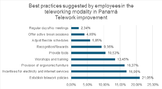 In the specific case of Panama, as it is considered a service economy, not all employers have the possibility to choose this type of work; however, an important group of companies can, without limitations, operate through telework, considering that Panama has good Internet connectivity, compared to other countries in the region. This study it can be concluded that the most impacted dimensions are related to the good practices of teleworking applied in companies according to the existing legal regulation in the country and the well-being of employees, among the reasoning generated from the questions posed reflect the nature of the data collected in the study sample.