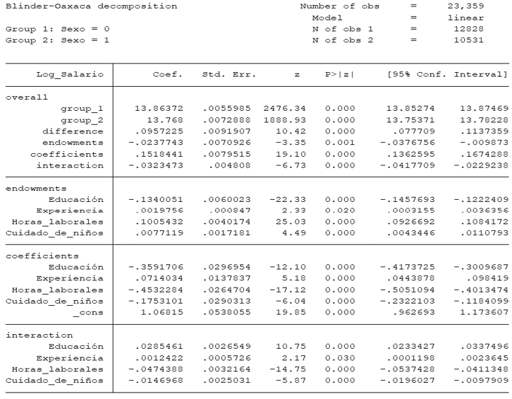 La descomposición lo que muestra son los valores esperados de cada grupo y su brecha en la primera parte del panel. Se observó que la media estimada del salario en términos logarítmicos para el género masculino es de 13,86372, mientras para el género femenino es de 13,768, con una diferencia significativa en los ingresos de 0,0957.