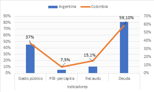 Un mayor porcentaje indica un mayor gasto gubernamental en relación con la producción económica. En este caso, Argentina tiene un gasto público más alto que Colombia, lo que podría indicar una mayor presión fiscal sobre la economía argentina.