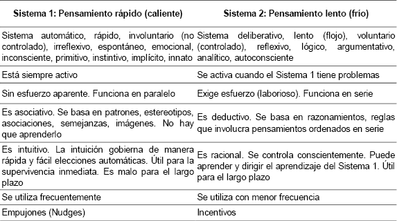 De acuerdo con Kahneman (2015), de manera figurativa, existen dos sistemas de pensamiento: el sistema 1 (automático) y el sistema 2 (reflexivo). En el sistema 1 hay sesgos, errores sistemáticos, mientras que en el sistema 2 no. Dicho esto, el sistema 1 opera la mayor parte del tiempo e influye en casi todas nuestras opiniones y decisiones. En cambio, el sistema 2 opera cuando se requiere.