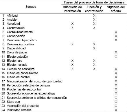 En el Cuadro 2 se presentan los veinticuatro (24) sesgos correspondientes a cada una de las etapas del proceso de toma de decisiones crediticias.