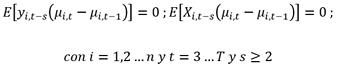 El estimador GMM se basa en el supuesto de que los términos de error no están correlacionados en serie y que las variables explicativas son débilmente exógenas o no están significativamente correlacionadas con realizaciones futuras de los términos de error bajo los cuales se cumple la siguiente condición de momento para el estimador en primera diferencia.