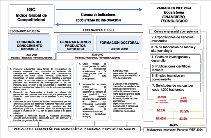 Ahora las variables que se han considerado para ir consolidando el desempeño del modelo de innovación al 2035 en Panamá, son los diversos Ecosistemas entre ellos Talento, Recursos, Financiero, institucional, redefinido en unas veinte variables que se miden con indicadores de desempeño que son los considerados por el Foro Económico Mundial, (Yu, 2024).