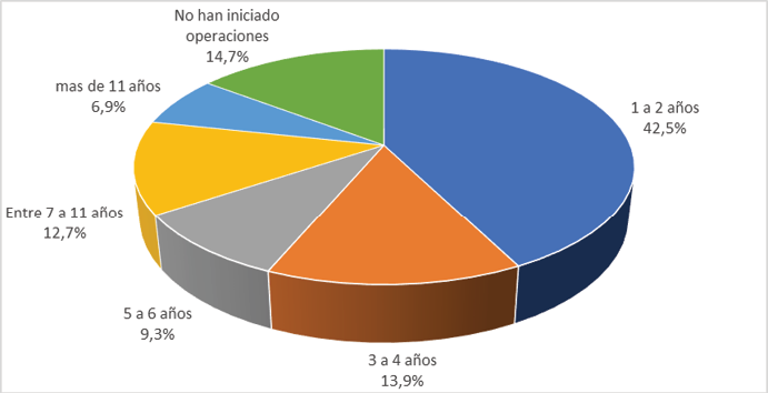 En cuanto al tiempo de operación, se puede identificar: de los 259 emprendimientos, 110 tienen entre 1 y 2 años de funcionamiento (42,5%), 36 entre 3 y 4 años (13,9%), 24 entre 5 y 6 años (9,3%), 33 entre 7 y 8 años (12,7%), 18 tienen más de 10 años (6,9%) y los 38 emprendimientos restantes no han iniciado operaciones (14,7%). En relación con la participación por años, se puede hacer una comparación con las cifras de algunas entidades nacionales como el DANE y COMFECÁMARAS, en donde se hace una relación entre los años de funcionamiento y el número de empresas que sobreviven. Según estas entidades, de cada 100 empresas que se crean en el país, 50% llegarán a los primeros tres años de vida, alrededor de 30% lograrán llegar a los 5 años de operación y solo el 10% logrará llegar a los 10 años de funcionamiento.