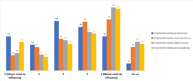 En los efectos adversos directos (gráfico 7), se puede apreciar que 66 encuestados consideran que la promoción sobre los emprendimientos productivos posee un nivel de influencia medio, siendo este el valor más representativo para el ítem, así como 45 encuestados, con una participación del 17,5%, consideran un nivel mayor de influencia. Los emprendimientos improductivos, destructivos y aniquiladores, desde la perspectiva de los emprendedores, poseen un menor nivel de influencia. Se evidencia que, en su mayoría, los emprendedores no consideran que la promoción del emprendimiento tenga un mayor nivel de influencia en los distintos tipos de emprendimiento, algo que se podría intuir en el surgimiento de los emprendimientos improductivos, destructivos y aniquiladores.