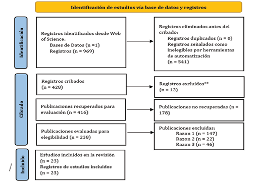 El proceso de identificación, clave en la metodología PRISMA para garantizar una búsqueda exhaustiva (Romero et al, 2024c), comenzó con 969 registros. Se eliminaron 541 registros ineligibles mediante automatización, principalmente por no ser de acceso abierto, quedando 428 para cribado. En esta fase, se descartaron 12 documentos no científicos, reteniendo 416 para evaluación detallada. De estos, 238 se evaluaron para su elegibilidad, excluyéndose 215 por: (1) 147 fuera del área de Administración, (2) 22 sin enfoque central en Spin offs académicas, y (3) 46 sin tratar financiación e incentivos para estas Spin offs (Cuadro 1).