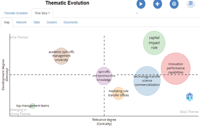 Los temas emergentes o en declive (Baja Centralidad y Densidad) incluyen “top management teams”, resaltando la creciente importancia del liderazgo y la composición de equipos en la gestión de spin-offs. Este concepto se vincula con competencias emprendedoras y capital humano (Cantner et al, 2023) y, aunque su centralidad es baja, su evolución indica la necesidad de explorar cómo los equipos directivos impactan el desempeño organizacional. Los temas de nicho (Alta Densidad, Baja Centralidad) abarcan “academic spin-offs,” “management” y “university”, fundamentales para comprender los modelos de transferencia tecnológica y el papel estratégico de las OTRIs en el fomento del emprendimiento académico (Zhou y Tang, 2020). Aunque no son centrales en la literatura general, mantienen gran relevancia en contextos específicos.