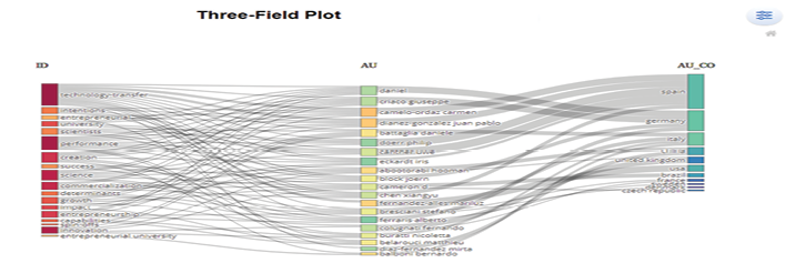 El gráfico de tres campos (gráfico 3). muestra la interacción entre términos clave, autores destacados y países de origen, revelando los ejes conceptuales y la estructura colaborativa en la investigación sobre Spin offs académicas. En el campo izquierdo, términos como “technology transfer”, “performance” e “innovation” resaltan como componentes centrales, destacando cómo la transferencia tecnológica y la innovación impactan en el desempeño de estos emprendimientos.