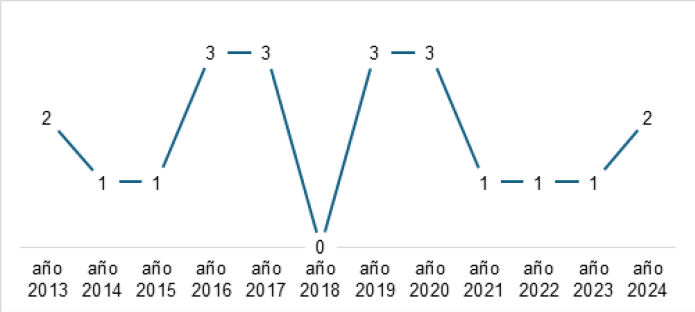 El gráfico 1 muestra el número de publicaciones sobre tiendas de barrio en Colombia que se encuentran en la base de datos Ebscohost a lo largo de 12 años para un total de 21 artículos publicados desde 2013 hasta 2024, donde se observa que la producción científica es baja, con una sola publicación en cinco de los 12 años analizados; en el año 2018 no se encontraron publicaciones, lo que se puede considerar como un punto crítico que requiere atención para entender las razones detrás de esta pausa. El punto máximo de publicaciones es de 3 artículos en los años 2016, 2017, 2019 y 2020.