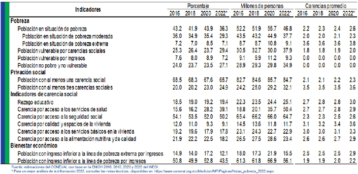 Población mexicana en situación de pobreza y carencias 2016-2022