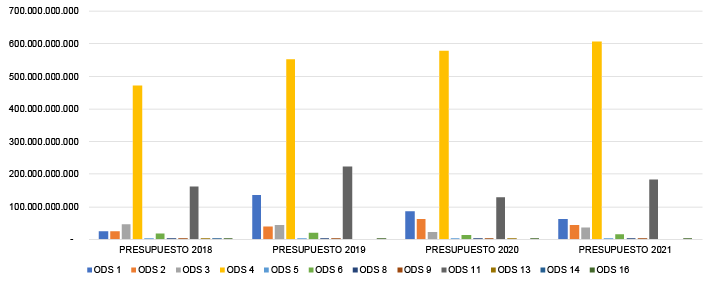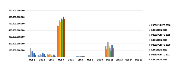 El presupuesto total para todos los ODS del Departamento alcanzó la suma de 193.38 millones de dólares, y su ejecución para la misma anualidad fue de 170.99 millones de dólares, lo que alcanzó un cumplimiento de 88.42%. Para el año 2019, el presupuesto fue de 261.09 millones de dólares, con una ejecución de 221.98 millones de dólares, representada su ejecución en 85,02%. En el año 2020, el presupuesto fue de 229,82 millones de dólares con una ejecución de 198,52 millones de dólares, cumpliendo el 86,38%, siendo superior a la ejecución del año 2019 y estando por debajo del porcentaje de ejecución del año 2018. Para el año 2021 se contaba con un presupuesto de 244,06 millones de dólares, pero la ejecución presupuestal fue de 196,38 millones de dólares, con un cumplimiento del 80,47%, porcentualmente por debajo de la ejecución del año anterior.