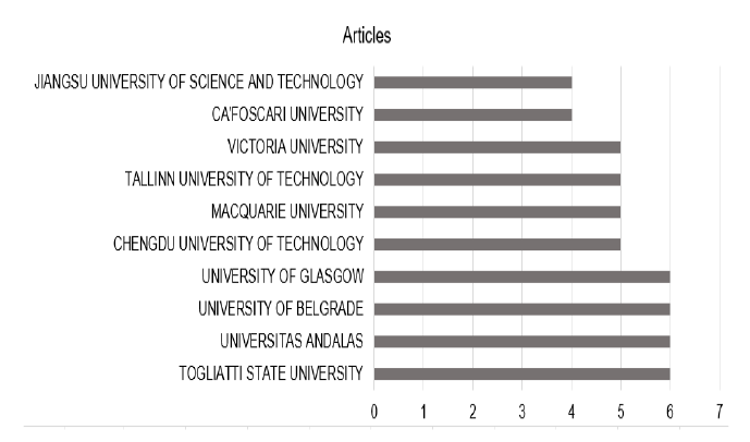 A total of 465 institutions related to the topic were identified in the search. Togliati State University, Universitas Andalas, University of Belgrade, and University of Glasgow stand out with six publications each. A large number of affiliations are shown due to the collaborative process involved in producing each document. However, no single affiliation with high scientific production in these topics is identified (graphic 2).
