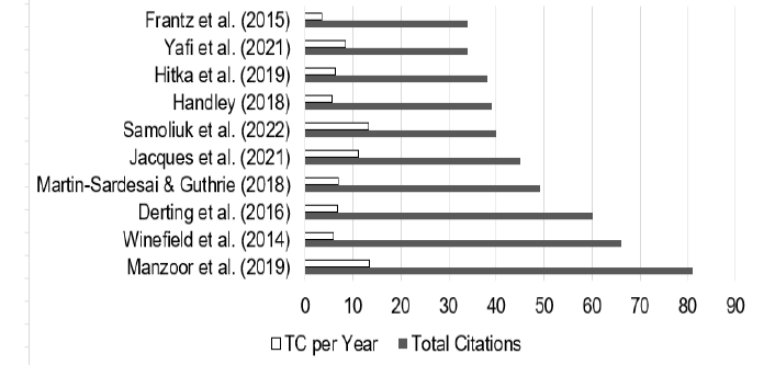 The analysis of the most cited documents within the Scopus database (Derting et al, 2016; Frantz et al, 2015; Handley, 2018; Hitka et al, 2019; Jacques et al, 2021; Manzoor et al, 2019; Martin-Sardesai & Guthrie, 2018; Samoliuk et al, 2022; Winefield et al, 2014; Yafi et al, 2021) revealed that Manzoor et al, (2019) is the scientific research with the highest number of citations, with 81 (graphic 3). This study highlights a set of practices for the sustainability of human talent management for better performance, which, despite its relation to universities and control, is not directly contextualized in universities. In terms of the average citations per year, Manzoor et al, (2019) also stands out with 13.50, followed by Samoliuk et al, (2022) with 13.33, and Jacques et al, (2021) with 11.25. Overall, it can be stated that there are research papers with a satisfactory level of impact; however, the main ones detected are not directly associated with the studied topic.